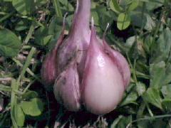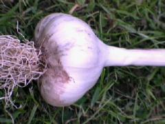 U česneku je velice důležitá správná doba sklizně. Pokud tuto dobu nevystihneme, cibule se již v zemi samy začnou rozpadávat na jednotlivé stroužky. Tím se hůře skladuje a je větší nebezpečí napadení skládkovými chorobami. Já si nechávám v každém řádku jednu rostlinu, na které ponechávám květní stvol. V momentě, kdy začínají listy česneku žloutnout a polehávat a u těchto rostlin se stočené květní stvoly začínají napřimovat, je nejvhodnější doba sklizně. Česnek sklízíme opatrně, neboť každé mechanické poškození, je vstupní branou pro choroby. Rostliny podryjeme, nejlépe, pokud to počasí dovolí, v době přísušku, opatrně z nich odstraníme zem a pokud se nebojíte, že Vám je někdo ze záhonu ukradne (bohužel dnes dosti častý jev), necháme je na záhoně volně rozprostřené doschnout. V opačném případě, nebo za deštivého počasí, je svážeme asi po 10-15 do svazků a zavěsíme je někam pod střechu na vzdušné místo. Tam česnek necháme do té doby, dokud mu nať zcela nezaschne. Když je nať zcela uschlá, odstřihneme jí asi 3 cm od okraje cibule, tu očistíme od země a odlomíme nebo odstřihneme zaschlé kořínky. Česnek skladujeme na bezmrazém místě. Občas jej prohlédneme a případné plesnivé nebo trouchnivějící cibule odstraníme.