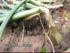 pokřivenou a zdeformovanou nať ihned vytáhneme a spálíme, aby nenakazila ostatní cibule. Ve druhé polovině